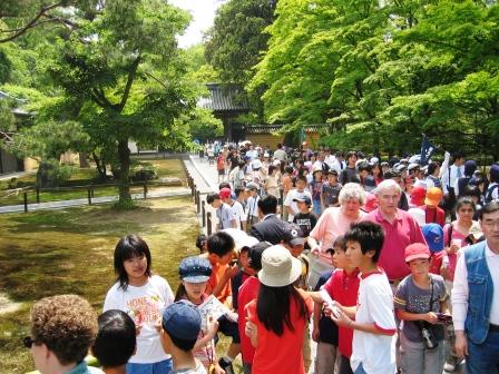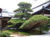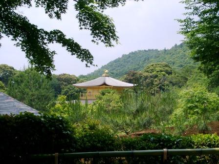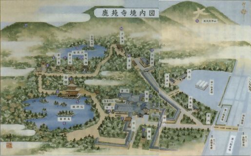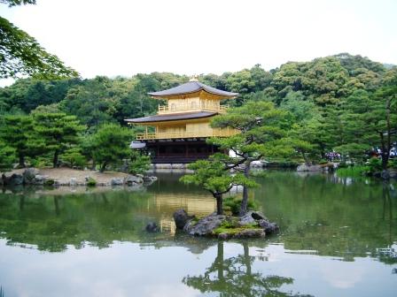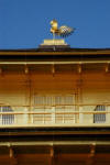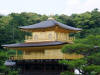 One of Kyoto’s most popular attractions is the Golden Pavilion (Kinkakuji), a three-story pavilion covered in gold leaf, glittering in the waters of a calm pond. The visitor’s brochure for Kinkaku-ji is almost entirely in Japanese (though it does include numerous photos and a watercolor map with legend in English and Japanese). From the English portion of the brochure (and other sources), the following can be gleaned: HistoryKinkaku (Golden Pavilion) is the popular name for one of the main buildings of this temple, which is properly called Rokuon-ji (Deer Park Temple, a temple dedicated to the Buddhist Goddess of Mercy, Kannon). The land was first developed as the kitayamaden (mountain getaway) of Kintsune Saionji (1171–1244) and included both a temple and a villa. The site became the property of Yoshimitsu (1358–1408), the third shogun of Ashikaga, who abdicated the throne in 1394. In 1397 he began construction of his retirement estate, and he made a special effort to make it a breathtaking site. He indulged in his peaceful life in this serene setting. After his death in 1408, the pavilion was made into a temple for the Rinzai sect of Zen Buddhism in accordance with his will; the name Rokuon comes from Yoshimitsu’s Buddhist name. All the buildings of those days came to ruin except Kinkaku. The garden, however, remains as it was in former days and can be enjoyed as it was hundreds of years ago. The Rokuon-ji Temple was registered as a UNESCO World Cultural Heritage site in 1994. BuildingThe pavilion as a shariden, a square reliquary hall used to enshrine relics of the Buddha. Each of its three floors is designed in a different style, yet the three harmonize well and create a spectacular architectural effect. The first floor, called the Hō-sui-in (Chamber of Dharma Waters) is in the shinden-zukuri palace style developed in the Heian period. It contains a large room and a veranda. In the days of Yoshimitsu, this floor was used as a reception hall for welcoming guests. The second floor was built in the style of samurai houses, buke-zukuri style, and is called Chō-on-dō (Hall of Roaring Waves). This is where Yoshimitsu held his private meetings with honored guests. This floor is decorated with paintings by Kano Masanobu (1434–1530) and holds an image of the Bodhisattva Kannon with Shitenno images on both sides. The final floor, known as the Kukkyō-chō (Firmament Top), is only a few square meters (about 23 square feet) and was used for intimate meetings with friends and tea ceremonies. It is built in the karayō, or Zen temple, style, inspired by the architecture of the Sung Chinese style. It has bell-shaped windows and three Amida images. On the shingled roof is a bronze statue of a phoenix just over a meter tall and covered with gold leaf. The second and third floors are covered with gold leaf on Japanese lacquer. In the late 1980s, the coating of Japanese lacquer was found to be a little decayed, and a new coating as well as gilding with gold leaf was applied; this renovation was completed in 1987. Today it is covered in gold leaf five times thicker than the original coating, and presents an awesome sight. Furthermore, the beautiful painting on the ceiling and the statue of Yoshimitsu were restored, with utmost care, to their original splendor. Finally, the roof was restored in the spring of 2003. Like many structures in Kyoto that have been repaired or repainted, the Golden Pavilion has also been completely rebuilt. Yoshimitsu’s pavilion survived centuries of fires and earthquakes only to be the target of an act of arson. Early in the morning of July 2, 1950, a 21-year-old student from Otani University, who also happened to be a monk, set fire to the pavilion. It was reduced to ashes, and upon his arrest the young man stated that he had wished to die in the flames. Newspaper reports of his trial state that because of the student’s “self-hate and self-detestation he hated anything beautiful.” Points of InterestThe pavilion and the pond on which it stands were designed to resemble the image of the Seven Treasure Pond in scenes of the Buddhist Paradise. The pond is even filled with lotus plants, symbolizing the flower of truth rising from the mud of the mundane world. Also placed in the pond are several stones and islands, representing the eight oceans and nine mountains of the Buddhist creation story. The name of the pond is Kyōko-chi (Mirror Pond). The pond contains many large and small islands. Climbing a few steps, you stand on the edge of another small pond, An-min-taku. The small stone pagoda on the island is called Hakuja-no-tsuka (“the mound in memory of the white snake”). The classic teahouse is called Sekka-tei. Inside, the teahouse is quite modest but contains a celebrated, crooked pillar supporting the alcove. The pillar is made from the wood of the nandin, a very slow-growing tree, so that to reach this size is very rare. The house burned down in a fire in 1874 and was reconstructed in 1884; it was most recently restored in 1997. On the way to the exit of the temple, you will find the small Fudōdō shrine (dedicated to the God of Fire) where the stone Fudō-myōō (Acara) is enshrined as a guardian. Our tour of this site was somewhat rushed since it is quite time-consuming just to walk from the entrance, through the gardens, to a point from which the Golden Pavilion can be viewed, and the site was mobbed with tourists, including a number of school groups. If it is even permitted to go inside the pavilion, we were not offered the opportunity. As usual, we either were not given the brochures until we were leaving or did not have time to refer to them as we sprinted from one photo op to the next. (Click on thumbnails to see larger photos.)