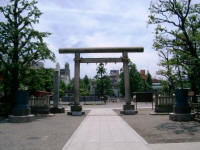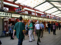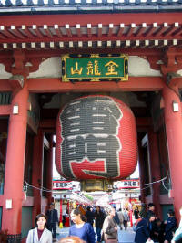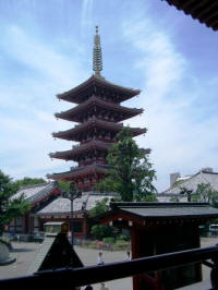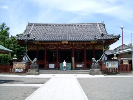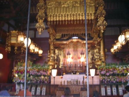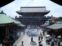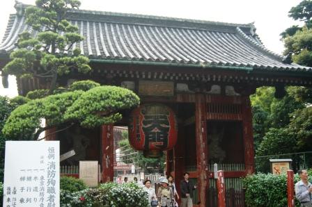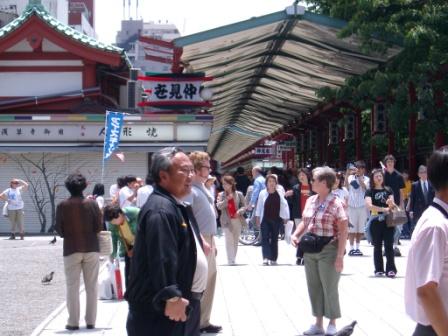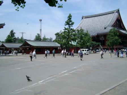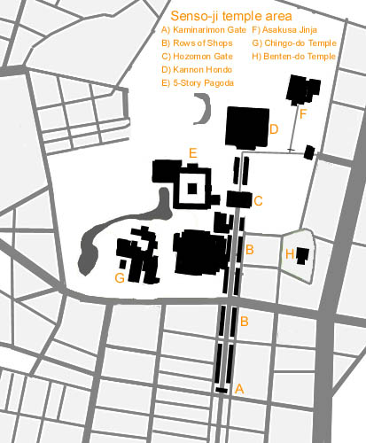 This was our last temple and the last stop on our tour, and, despite the historic significance of the site, it was clear that the visit was primarily for the purpose of topping off on souvenirs, since the “shopping street” is one of the most distinctive features of this precinct. “Asakusa Kannon” is the popular name of the temple more properly known as Kinryūzan Sensō-ji (金龍山浅草寺). It is located in Asakusa, a central part of the Shitamachi district of Tokyo. (Though sometimes translated as “downtown,” the word more properly means “low town” or “town below,” the area below Edo Castle but still within the city limits. It is the older, traditional section of Tokyo.) Legend has it that in the year 628, two brothers, Hinokuma Hamanari and Hinokuma Takenari, fished a tiny gilt-bronze statue of Kannon, the goddess of mercy, out of the Sumida River, and even though they put the statue back into the river, it kept returning to them. The chief of their village, Haji-no Nakatomo, recognized the sanctity of the statue and enshrined the statue by remaking his own house into a small temple in Asakusa so that the villagers could worship the Kannon. The first temple hall was built by the priest Shokai in 645, making it Tokyo’s oldest temple. The thirteenth-century history of the temple saw the development of Asakusa from a poor fishing village into one of the largest cultural and religious centers in Japan. The temple was the official prayer hall of the Kamakura shogunate from the twelfth through the fourteenth centuries and also was known as the origin of the colorful culture of the Edo era. Because of its cultural background, many of the temple’s properties are designated by the government as national treasures. In the spacious compound stand the main temple, three gates, and six important buildings. The approach to the temple begins at the Kaminarimon (“Thunder Gate,” which houses statues of the gods of Thunder and Wind, Raijin and Fujin) and runs 140 meters (or “over 200 meters” or “about 250 meters” according to other sources) northward along Nakamise-dori arcade, a crowded lane lined with shops. Nakamise was first formed around 1685 when the 12 subsidiary temples belonging to the Sensō-ji temple that lined both sides of the street were permitted to put out souvenir stalls in front of local houses in exchange for a promise by local residents to keep the area clean. It began to be called Nakamise (“inner shopping street”) because it is located between the shops of Kannondo-mae and the Asakusa-Hirokoji path. Besides typical Japanese souvenirs such as yukata, paper umbrellas, and folding fans, various traditional local snacks from the Asakusa area (such as senbei rice crackers) are sold along the Nakamise. Once makeshift stalls, today the 87 shops have a movable overhead cover to protect shoppers from inclement weather. The Hōzōmon (“Treasury Gate”), at the end of the street, marks the entrance to the temple. The main hall, known as the Kannon Hondo, sits in line with the gates (as shown in the plan below). The temple is renowned for its giant red lanterns that hang from the gates and underneath eaves. You reach the main hall after passing a huge cauldron of smoking incense. For a cure, wave the smoke towards areas of your body that ache. We actually entered the temple precinct from the east, through the Nitenmon (“Gate of Two Gods”), which was built in 1618 and is designated as an Important Cultural Property. The gate’s plain wooden pillars are all that remains of the Toshogu shrine honoring Tokugawa Ieyasu, which was relocated to Ueno in 1651 after a series of fires. Niten-mon has since been rededicated and now houses two seventeenth-century Buddhist guardians of the south and east, Jikokuten and Zōchōten. In contrast to the Nitenmon, the temple itself and most of the rest of the buildings on the site, like much else in Japan, were destroyed by air raids in 1945. The temple was rebuilt in 1958 in a unique architectural style, irimoya zukuri, made of ferroconcrete, and the steeply sloped main roof was tiled with 72,000 tiles. This was at least the fourth time the main hall had been rebuilt; the current temple structure replaced one built in 1651. During the war the image of Kannon and several other artworks were buried and spared from destruction. The three huge lanterns hanging from the main hall were donated by geishas from various areas in Tokyo, alluding to the important role Asakusa played in Edo times as an entertainment area. Tucked away in the northeastern corner of the temple grounds is the Asakusa Jinja shrine, dedicated to the two Hirokuma brothers who found the Kannon statue for which Sensoji was built, and Hajinoatai Nakatomo, their lord who initially enshrined the statue in his private residence. The origins of the Sanja Matsuri are rooted with the Sanja-sama, the Shrine of the Three Guardians, by which this place is also known. The shrine was founded in 1649 by Tokugawa Iemitsu, the third Tokugawa shogun.