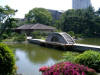 (“straddling rainbow bridge”) across Takuei Pond. As usual, modern Japan is