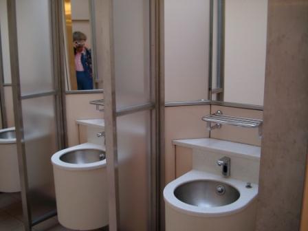 Glenn provided the following tips about “toilets”: There is a much wider range of conveniences in Japan than in the U.S. Some, in new buildings and in all hotels, are modern and clean, with luxuries that you wouldn’t expect, such as heated toilet seats and built-in bidets. However, many older buildings, train stations, and rural areas may have toilets that are not conspicuously clean and odor-free. The traditional Asian toilet does not have a seat; it is an enameled hole in the floor over which you squat and try to aim. It is a challenge for older people, and many in Japan use it with more reluctance than nostalgia. Toilet paper, hot water, and paper towels cannot be taken for granted in every washroom. Carry a small packet of Kleenex for emergencies, and always have a handkerchief to dry your hands after you wash. The good news is that you can always find a modern toilet if you have enough patience, and you are also allowed to use the toilets for the handicapped anywhere, which are always much larger with more modern facilities. All of this information proved useful, and Glenn’s inclusion of this topic as one of the “six T’s” did not represent an exaggeration of its importance. It was a source of great amusement to all of us that the variety and quality of public (and private) conveniences was such a “hot topic” among us. This was particularly noticeable when we were riding the shinkansen to Hiroshima and one person after another, returning from the restrooms, would provide a sotto voce report on the facilities offered. We were constantly intrigued by every novelty in this regard, and from the number of Web sites I found devoted to, shall we say, “Toilets of the World,” it would appear that quite a few people share this fascination! The bathroom in our hotel room in Osaka was our first introduction to the ubiquitous Toto Washlet, which so impressed us that (like many other tourists) I took pictures of it. Toto, for those who don’t know, is the American Standard of Japan. Virtually every toilet we saw in the country, as well as lavatories and other bathroom furnishings, was made by Toto. The Washlet has been described with humor and verve in several newspaper articles (see “Luxury Loo: The Seat Also Rises” and “But Do They Flush? Japan's High-Tech Toilets Do Nearly Everything, Even Redden Faces”). It more or less converts a toilet into a bidet, and Barney became so spoiled by the end of our visit that he was ready to come home and buy one for our bath. I had to remind him that we had actually seen one at a home show here in 2001. In fact, Toto now has a presence in the United States and sells Washlets manufactured in Georgia. The Washlets we experienced had varying features and controls. The one in Osaka was the only one with instructions in English, but, having learned to use it, we were able to pretty well figure out the others we encountered. All models featured water jets that could be aimed either of two ways (from the pink and blue icons, we surmised that these resolved into basically female and male settings). Some had temperature and/or pressure controls; one also had hot/cool air drying. Some had heated seats. The seats in the restroom at the Narukawa Art Museum in Hakone were made by a different manufacturer and had remote controls. I believe it was also that restroom that had a button to push to make a flushing sound. Japanese women seem to be especially plagued by the condition sometimes known as “bashful kidney” and used to be prone to flush a toilet before using it to cover up the sound of their functions. To prevent this waste of water, Japanese ingenuity devised a machine to provide the sound without the water. We suspected this might also have been the purpose of the “warm-up” cycle that our Osaka Washlets went through when we sat down on them, though the instructions claimed some other vague purpose. Another uniquely Japanese type of toilet we encountered from time to time was the kind with a faucet on the back. When the toilet is flushed, water runs from the faucet into a drain and back into the tank. While this wouldn't suffice for thorough hand washing, it was ideal for a quick dabble—and wastes no water! As Glenn predicted, most of the hotels and public buildings we visited had at least some Western-style toilets, for which there was often a line while Japanese-style cubicles went begging. Some of the toilets even had Washlets. In addition to the ones at the Narukawa museum, we also encountered these in the public restrooms at Yodobashi Camera. At many of the tourist attractions we visited, however, there were no Western-style cubicles. I used the Japanese-style squat toilets when I had to, though they were a trial for my arthritic knees. In well-maintained restrooms, especially those with a grab bar, this was not as difficult in the more squalid ones. Some of the public restrooms we encountered were especially memorable. One of these was at a rest stop where we stopped on the expressway between Mount Fuji and Tokyo. It had everything! In addition to very nicely appointed Japanese-style and Western-style cubicles, some with baby seats or changing facilities and some with extra space for luggage, it had a “primping” area separate from the main bank of lavatories and a row of low urinals for little boys accompanying their mothers. It also featured the very efficient type of hand dryers used in Japan. As Glenn warned, most restrooms have neither paper towels nor hand dryers, but when dryers are present, they are of this “duplex” type, which dry both sides of the hands at once. Provided, according to Glenn’s advice, with packets of Kleenex and handkerchiefs, we were ready for anything, as were most of the Japanese, though in one restroom nearly-used-up rolls of toilet paper had been lined up on the top of a radiator near the sinks and were being used for hand drying. I had bought an inexpensive bandanna ($1.02 at Wal-M