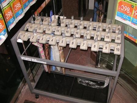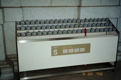 As noted in the Facilities sidebar, we (Barney especially) were enthusiastic about the high-tech toilets. We also, once we got the hang of it, really appreciated having hot water for tea always instantly available. Every room we stayed in had some sort of electric kettle. While some were jug-style, most were pump pots. I could definitely get used to having one of those around! Another clever feature we noticed on the kettle in Yokohama was the magnetic plug. While some jug-style kettles are removable from a base that remains plugged in, this one was easily detached from its cord, but reattaching it was facilitated by a connection that magnetically snapped into place. Another amenity we were favorably impressed by was non-fogging vanity mirrors in the bathrooms. In every hotel we stayed in, a portion of the mirror remained fog-free even when the room filled with steam. We didn’t analyze this miracle at the time, but I have since learned that it is accomplished by means of a wafer-thin (1/16") heating pad adhered to the back of the mirror and wired into the light or ventilator switch. It would appear that this feature is standard in good hotels throughout Europe and Asia, and I hope to see it spread to the United States soon. Many electric and electronic devices seem designed to intrude gently. We noticed that the phones ring softly at first, becoming gradually louder with each ring. Someone theorized that this is because only one of several phones in the room rings first, later joined by the each of the others (which could be a limitation of their ringers), but I’m not sure that’s the entire answer (though most of the rooms we stayed in had at least two phones). In any case, it was an especially welcome touch for a wake-up call. Similarly, the lights in the bathroom of our room in Tokyo brightened gradually. The first time I entered the bathroom, I was dismayed by this. I flicked the light switch and was greeted by a response that made me wonder if I had sunglasses on or was going blind. Before I had time to complain of it, however, the lighting had come to full strength, and it took a couple of repetitions for me to understand what was happening. The same effect was noticeable with the fluorescent “bulbs” in some of the room lamps. I suspect that they just require some warm-up time (if you turn the lights off and immediately back on, they come on at full strength), but certainly if you get up in the middle of the night, it’s pleasant not to be blinded by turning on the light. As mentioned in the Facilities sidebar, we were very favorably impressed by the Japanese hand dryers. Although they run on 110V current, they are much more powerful and effective than any 220V hand dryer we’ve ever encountered in the United States, especially since they dry both sides of the hands at once. Another convenience were the ubiquitous provisions for umbrellas. It rains a lot in Japan, so everyone carries an umbrella, and chances are better than even that the umbrella is wet. The concept of umbrella bags has made its way to the United States (our supermarket provides clear plastic umbrella covers at the entrance), but even this humble accessory is high-tech in Japan: insert your umbrella into a mechanical device and it is bagged automatically! One of the companies that makes these “umbrella sleeve dispensers” is Kasapon. Its Web site is not only informative but, when I first discovered it, was accompanied by a very bouncy rendition of “Singin' in the Rain” (it now has rain noises instead). A U.S. firm, RainSafe, is attempting to promote these devices in the States, but so far I have not encountered one. At the entrance to the Yokohama Novotel was a sort of umbrella check stand that we found intriguing. Insert your umbrella, then turn the numbered key and take it with you. One online source suggested that this device was designed not so much to prevent theft as to make it easier to find your umbrella amongst a mass of similar ones (in crowded locations such as theater lobbies). This photo gives a better idea of how it works. Casual theft seems not to be much of a problem in Japan, and we were impressed by the unsecured, usually covered bike parking areas we saw at bus stops—until Matthew pointed out that the bikes were actually protected by unobtrusive wheel locks. Japanese food and eating in general provided much that was unfamiliar. Some things we liked at first and then tired of (after a few meals, including breakfast, that were heavy on fish, Barney said he wanted to eat something that had not slept in the ocean the night before), but it’s hard to find fault with a dining custom as welcoming as oshibori (heated damp towels for washing the hands before, during, or after eating). Sometimes, as at Denny’s, these were actual cloth towels wrapped in plastic; in other cases they were like large “moist towelettes”; but they had always been heated, presumably in a microwave. They went a long way toward making up for the lack of usable napkins. A nifty novelty that we especially liked was the way table sugar was packaged. Although we did sometimes encounter portion sugar in packets or “sachets” as in the West, in most instances the sugar was packaged in tubes that we referred to as “sugar sticks.” After returning home and searching on the Web for “sugar tubes” and the like, I found that these are actually called “sugar sticks”! Although most of the illustrations I saw online were rather loosely packed, relatively wide rectangular packages, most of those we collected as souvenirs were narrow tubes so tightly packed that the result was a pencil-like cylinder. Since returning home we have encountered these sticks elsewhere and really like them. Not only are they attractive, but they have the advantage that if you want to use only half a teaspoon of sugar, it is easy to pinch the stick in the middle and dispense just half of it. Another novelty that we became quite fon