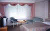 had two “double” beds and a large seating area. Behind the sheer curtains were